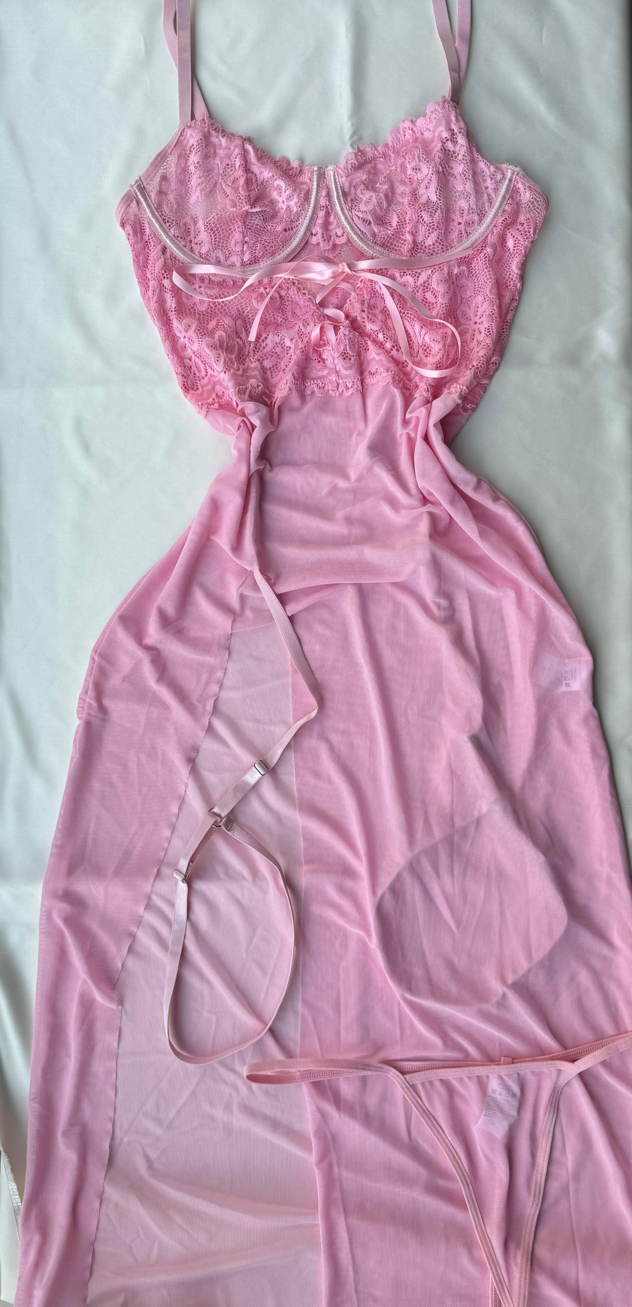 This breathtaking pink baby doll set redefines allure with its flowing, delicate design, crafted like a thin, long dress that gracefully hugs your curves.